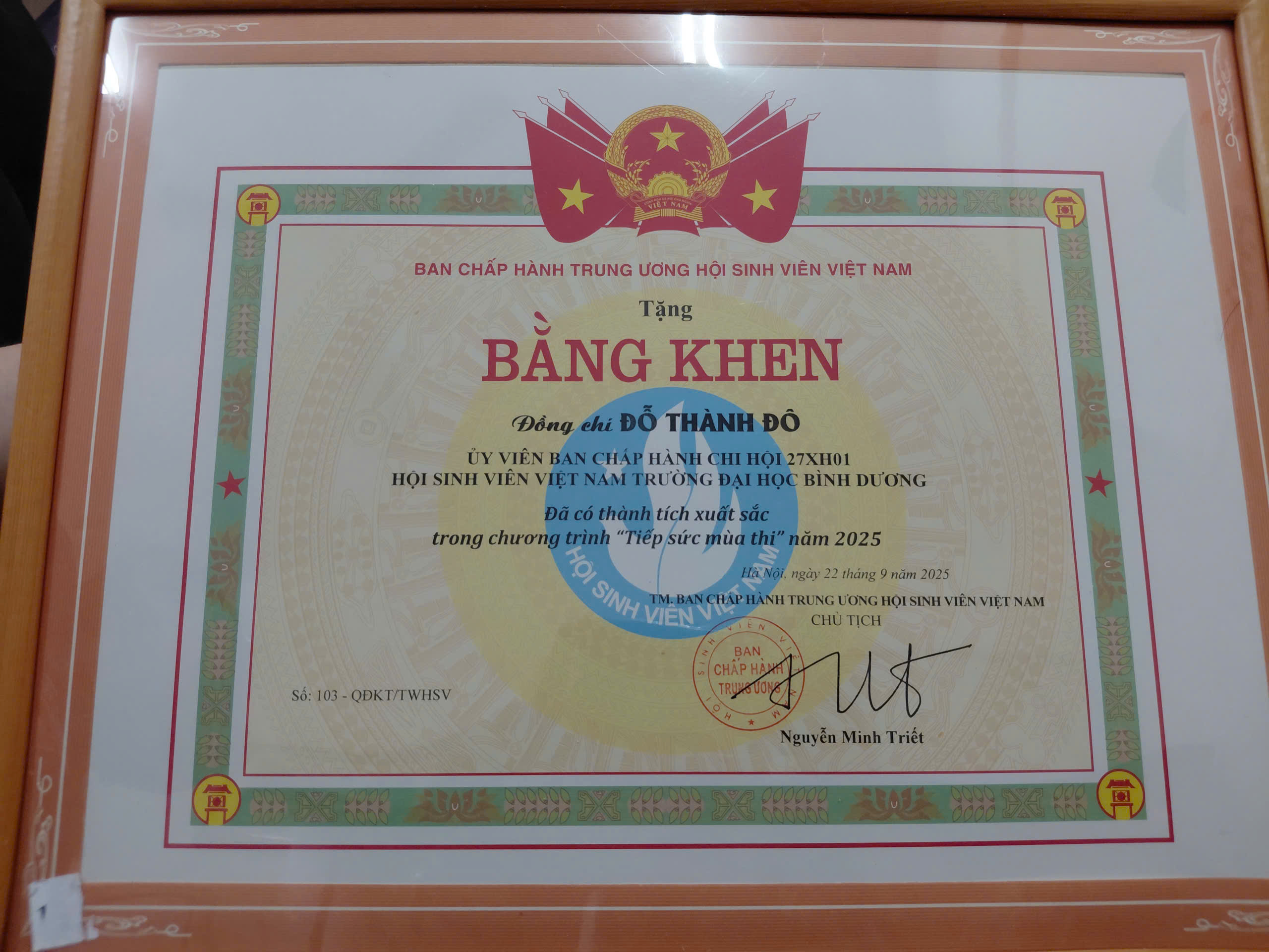 Niềm vinh dự khi nhận bằng khen từ Ban Chấp hành Trung ương Hội Sinh viên Việt Nam