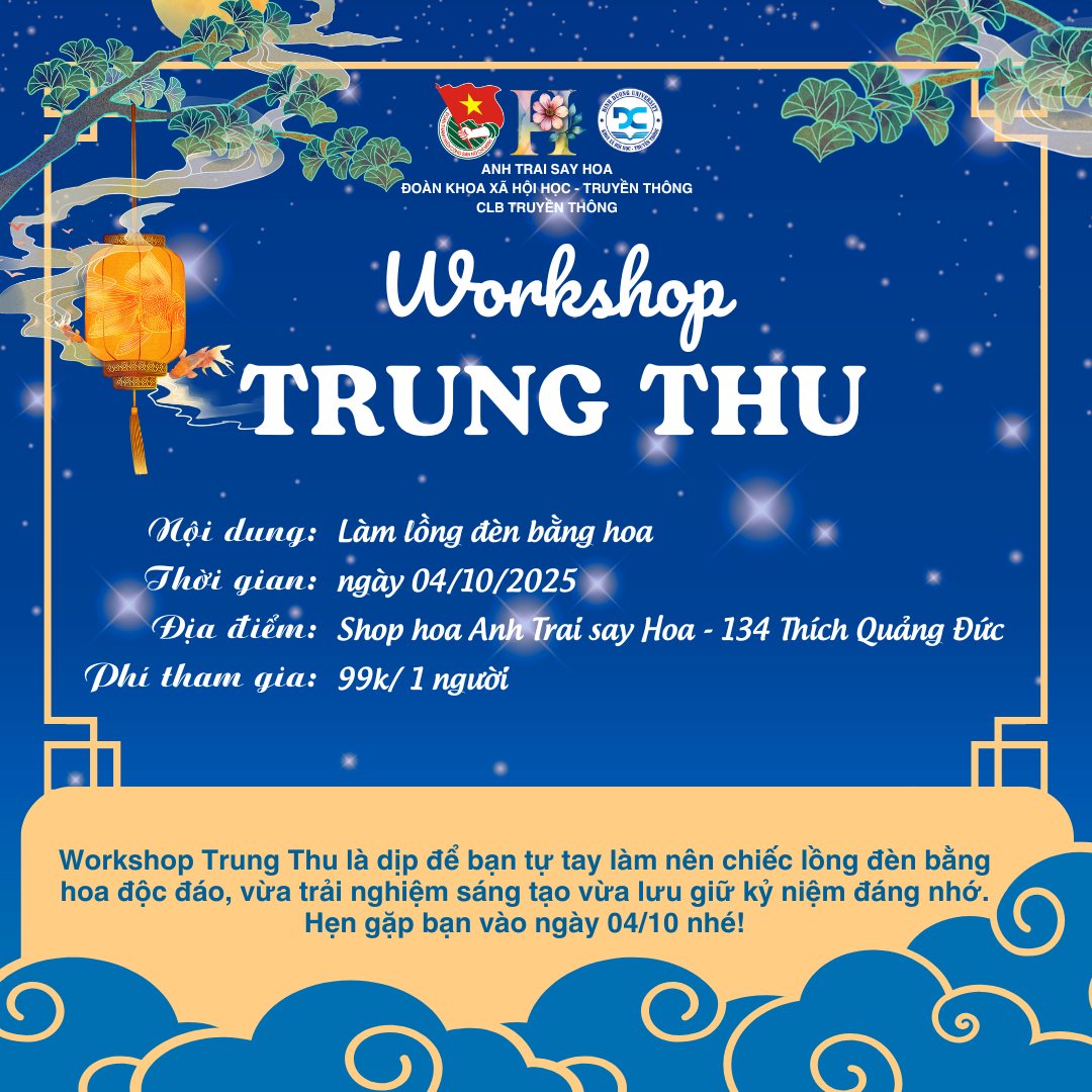 💖 Nếu chưa thì đừng bỏ lỡ cơ hội tham gia Workshop Trung Thu cực xinh xắn, sáng tạo cùng Đoàn Khoa Xã hội học - Truyền thông, CLB Truyền thông và Shop hoa Anh Trai say Hoa nhé!
